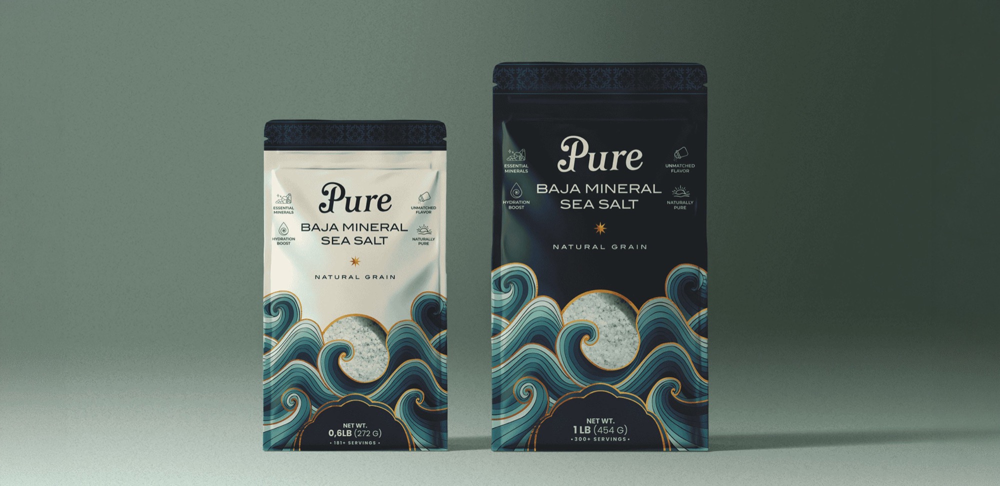 Premium sea salt brand celebrating the pure, mineral-rich waters of Baja California with elegant packaging and natural authenticity.